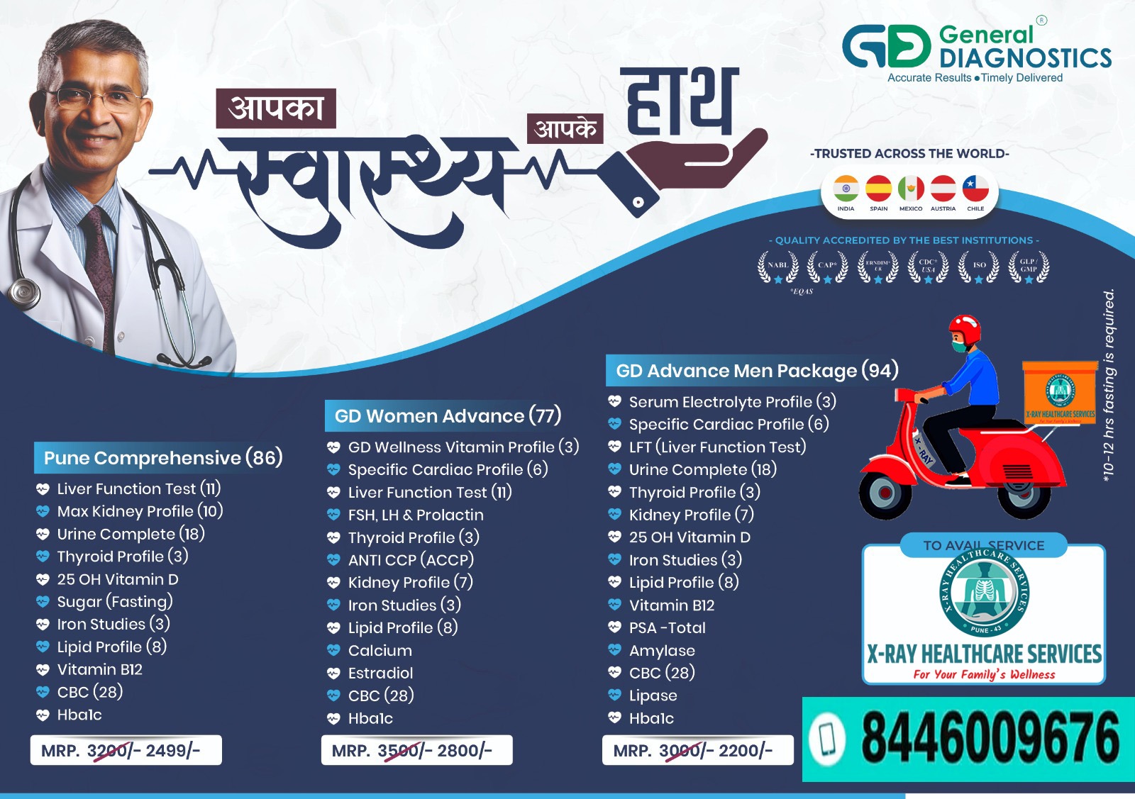 X-Ray healthcare services, providing digital X-ray and other healthcare services at people's doorsteps in Pune and PCMC. This is a great way to make healthcare more accessible, especially for individuals who may find it difficult to visit clinics or hospitals 1. Home Sample Collection: Blood Tests: Offer a variety of tests like CBC, cholesterol, liver function, kidney function, and more. Urine Samples: Easy collection of urine samples for routine or specialized tests like urinalysis or pregnancy tests. Swab Collection: Provide services for collecting samples like throat or nasal swabs for COVID-19 or other infections. Easier Access for Elderly/Disabled Patients: This service would be particularly beneficial for those who are elderly or disabled and have trouble going to clinics or labs. 2. Health Checkups: Blood Pressure Monitoring: Regular monitoring and tracking of BP at home can help with early detection of hypertension. ECG at Home: Portable ECG devices can be used to check heart health, especially for those with known heart conditions or in need of routine monitoring. Diabetes Monitoring: Offer home blood glucose testing, along with checkups for patients who need regular monitoring. Oxygen Level Testing: Checking oxygen levels (SpO2) at home, especially important for people with respiratory conditions. Chronic Disease Management: For patients with ongoing health issues like hypertension, diabetes, or asthma, regular checkups can be provided in the comfort of their homes. 3. Online Consultations: Telemedicine Consultations: After receiving test results like X-rays, blood work, or ECGs, offer online consultations with experienced doctors or specialists. This allows patients to discuss their results and treatment options without needing to leave home. Follow-Up Care: Provide virtual follow-up consultations after any procedure, test, or treatment to ensure patients are recovering well and to answer any concerns. Specialist Referrals: After consultations, doctors can refer patients to specialists for further treatment if needed, with the convenience of receiving their referrals digitally