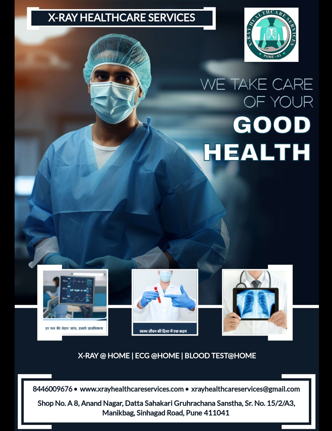 Skip the travel, skip the wait—get the medical diagnostics you need from the comfort of your home. X-Ray Healthcare Services brings professional, hospital-grade diagnostic care directly to you. Whether you need digital X-rays, ECGs, blood sample collection, urine testing, or other essential services, our experienced medical team ensures fast, reliable results without the hassle of clinic visits. Our at-home diagnostic services are ideal for: Elderly patients who prefer or require home-based care Individuals with limited mobility due to disability, injury, or illness Busy professionals and families seeking convenience Post-surgery or bed-bound patients who need monitoring and care Your health is important. Your time is valuable. With X-Ray Healthcare Services, you don’t have to choose between them. 📞 Book your at-home appointment today and experience quality care—on your schedule.